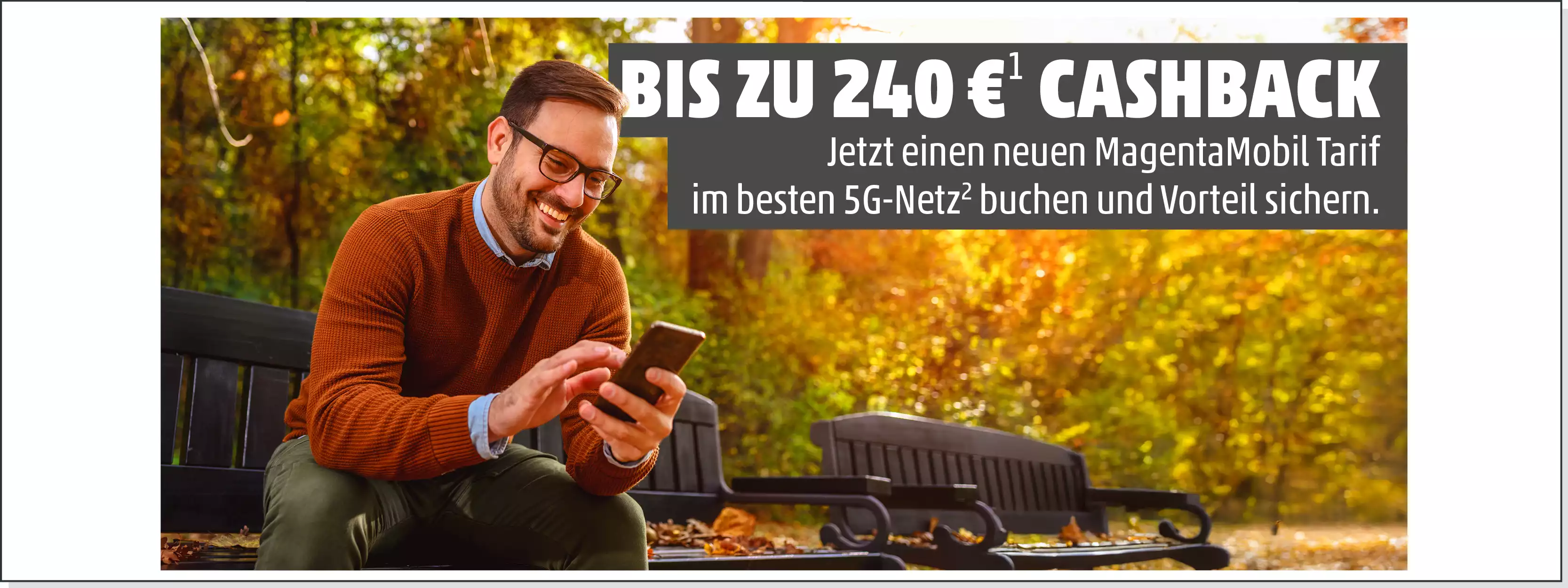 1) Im Aktionszeitraum 01.10.–18.11.2025 erhalten Kunden bei Abschluss eines neuen Mobilfunk-Vertrags mit einer Mindestvertragslaufzeit von 24 Monaten in den Tarifen MagentaMobil XS und S mit oder ohne Endgerät einen Cashback in Höhe von 120 € sowie in den Tarifen MagentaMobil M, L und XL mit oder ohne Endgerät einen Cashback in Höhe von 240 € gutgeschrieben (ausgeschlossen sind PlusKarten Tarife, Young Tarife, Special Tarife, DTAG-Tarife, for Friends Tarife sowie Corporate Benefits Tarife und Datentarife). Einmaliger Bereitstellungspreis jeweils 39,95 €. Die Gutschrift ist nicht mit weiteren Aktionspromotions wie z. B. 6 Monate Grundpreisbefreiung kombinierbar. Zum Erhalt der Gutschrift (nach Ablauf der Widerrufsfrist) ist vom 01.11.2025–31.07.2026 eine Online-Registrierung über die MeinMagenta App (mit Klick auf Ihr Profil, „Cashback einlösen“) unter Vorlage der ersten Rechnung entsprechend den genannten Bedingungen erforderlich.